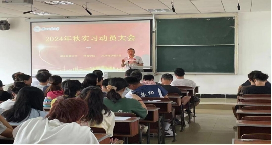 在开展“名师”进校院系讲座活动的同时,9月3日,体育学院院长何斌、副院长胡庆华、教学科长肖杰文、学生科长张弋明出席了实习动员大会,何斌院长作了动员讲话,强调了实习对于体育专业学生成长成才的重要性,指出实习是检验学习效果、提升专业技能的重要途径,他鼓励同学们要珍惜实习机会,努力在实践中增长才干、锤炼品格。