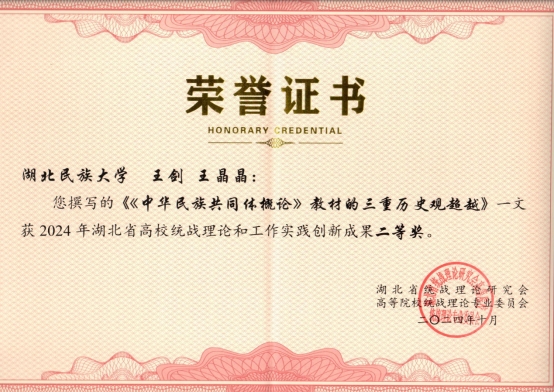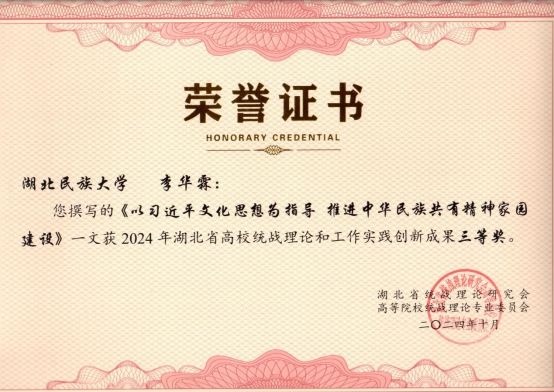 本次年会上,研究会表彰了4篇优秀调研报告、8个2024年度统战理论研究优秀组织单位以及86篇优秀论文。bat365官网教师提交的理论文章中有4篇获奖,王剑、王晶晶的《<中华民族共同体概论>教材的三重历史观超越》获二等奖;张新平、覃杰的《新质生产力下地方民族高校为铸牢中华民族共同体意识的人才培养路径思考》、李华霖的《以习近平文化思想为指导 推进中华民族共有精神家园建设》、胡兆义的《理念、过程与效果:铸牢中华民族共同体意识的情感路径》获三等奖。