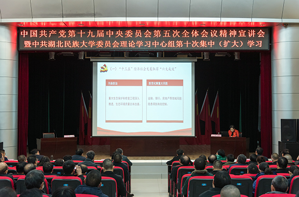 11月27日下午,中国共产党第十九届中央委员会第五次全体会议精神宣讲会暨bat365在线中国登录入口委员会理论学习中心组第十次集中(扩大)学习在行政楼1号会议室举行,湖北省省委宣讲团成员、省人社厅党组书记、厅长刘艳红作题为《深入学习贯彻党的十九届五中全会精神开启全面建设社会主义现代化国家新征程》宣讲报告。学校党委书记吴建清主持。学校领导、全校副处级及以上干部、马克思主义学院专任教师及学生代表参加学习。