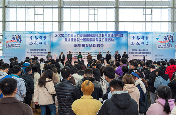 当天,刘艳红还出席了在bat365官网篮球馆举办的2020年全国人力资源市场高校毕业生就业服务周暨湖北省就业援藏援疆活动恩施州专场招聘会启动仪式并致辞。省民宗委党组成员、副主任李爱旻,省劳动就业局局长熊娅玲,恩施州副州长高敬佩及省援藏办、省援疆办等部门领导出席了招聘会启动仪式。