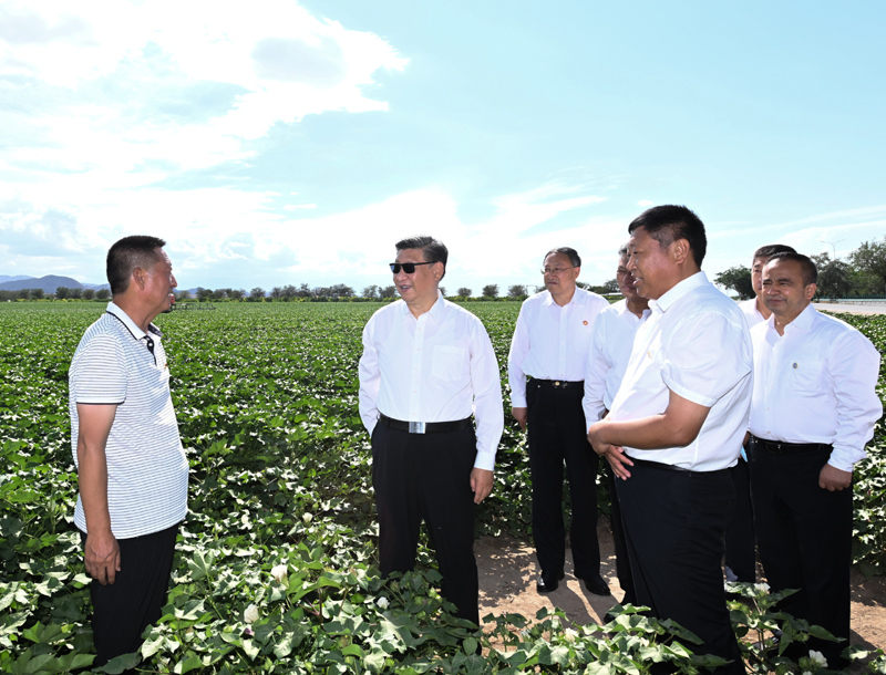 7月12日至15日,中共中央总书记、国家主席、中央军委主席习近平在新疆考察。这是13日下午,习近平在新疆生产建设兵团八师一四三团农一连棉花种植基地考察。新华社记者 谢环驰 摄