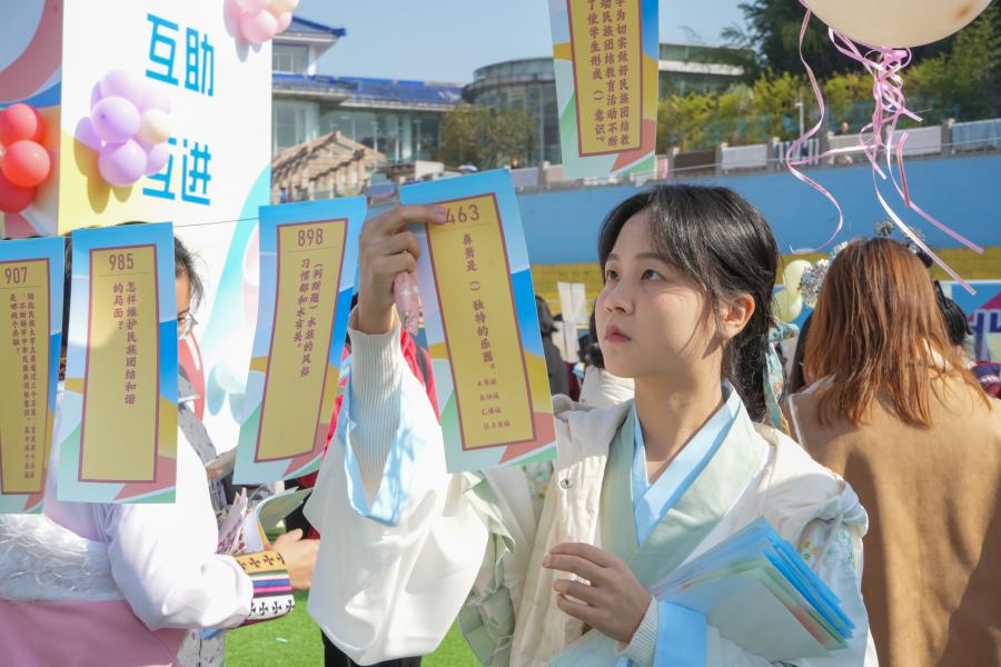 “交流 交往 交融 互学 互助 互进”民族知识竞赛以猜灯谜的形式进行,充分考察参与者对各民族文化的知识积累程度,不仅让学生了解到有关少数民族的知识,还让学生萌生继续学习少数民族文化的兴趣,营造各民族“交流、交往、交融,互学、互助、互进”的良好校园氛围。藏族学生旦增扎西告诉记者,“民族文化节不仅让我们有机会展示自己的民族文化,也让我们对我国多元一体的民族文化有了更全面的认识,我们各民族学生应当积极推动民族文化交流交融,增强民族自豪感和凝聚力。”