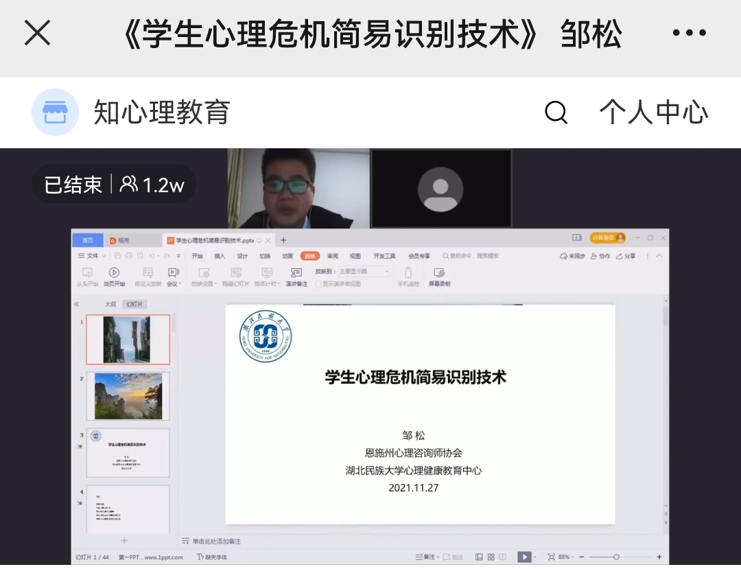 11月28日晚,民进会员、恩施州心理咨询师协会会长、bat365官网心理学教师邹松受湖北省心理学会中小学心理健康教育专委会邀请做客“2021心理健康教育专家讲坛”,通过线上直播作了《学生心理危机简易识别技术》专题讲座,华中师范大学彭明副教授主持本次活动。