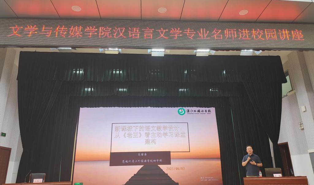 本网讯(通讯员 贾雨欣)6月5日,恩施清江外国语学校初中部龙凤校区校长、中学高级教师吴绪海应邀到访我院,在行政楼一号会议室为汉语言文学专业师生作了题为“基于新课标的主动学习——以部编版《老王》为例浅谈语文学科的教学设计”的讲座。讲座由文学与传媒学院副院长江佳慧主持,汉语言文学专业...