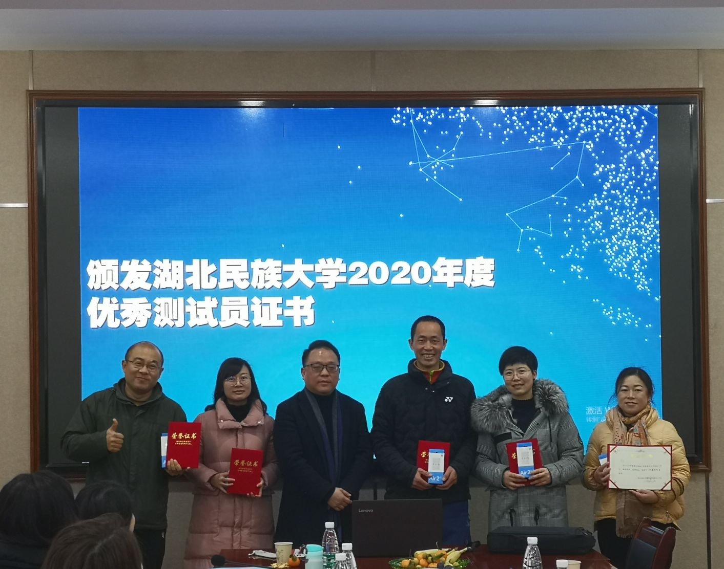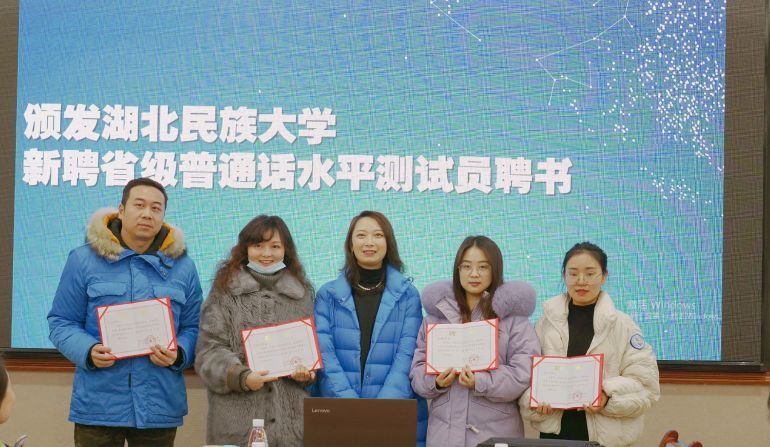 随后,郑艺副主任为2020年新聘的省级普通话水平测试员颁发了聘书,并希望他们能尽快的适应角色,早日成为测试员队伍的骨干力量。文学与传媒学院罗翔宇院长为bat365在线中国登录入口2020年优秀测试员颁发了证书,鼓励他们发挥良好的示范带头作用,为进一步提升bat365官网良好的语言文字规范意识而努力。
