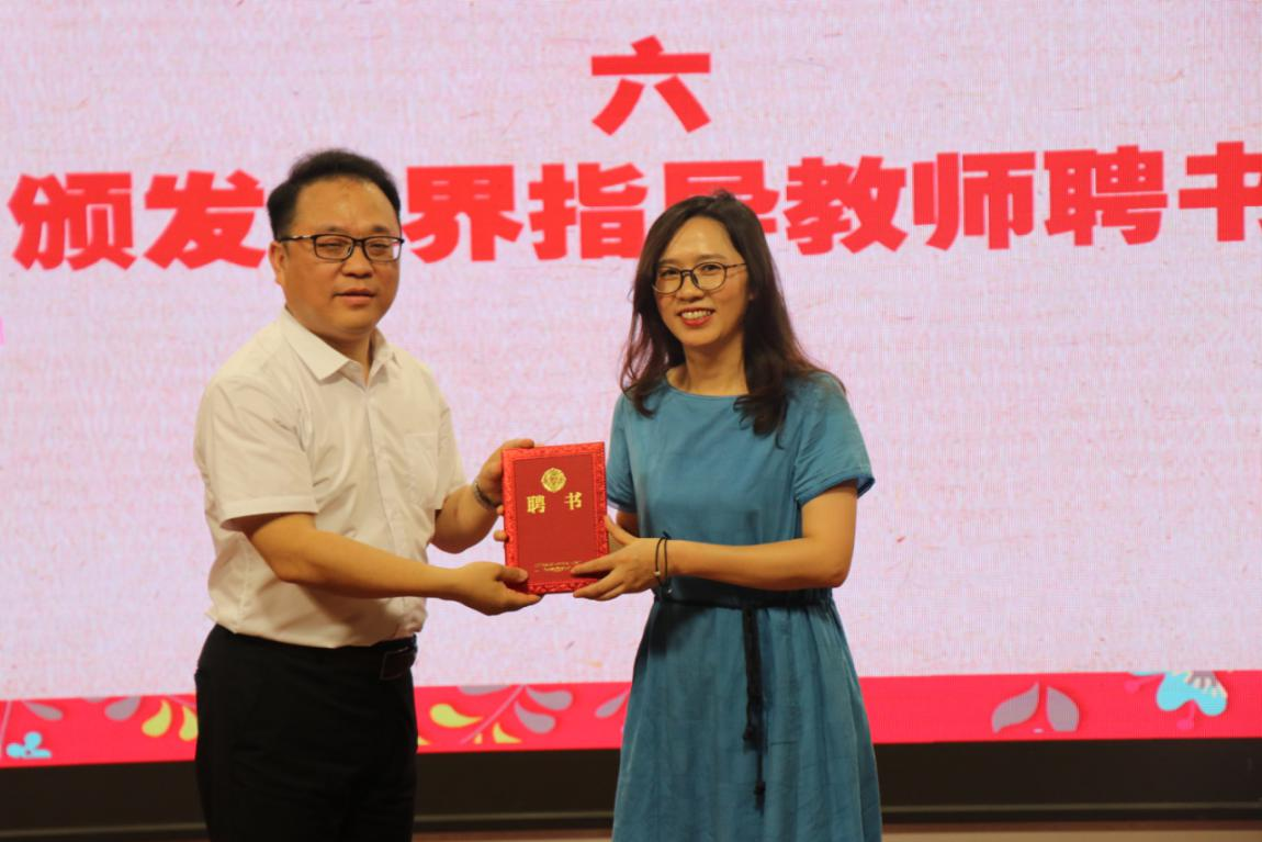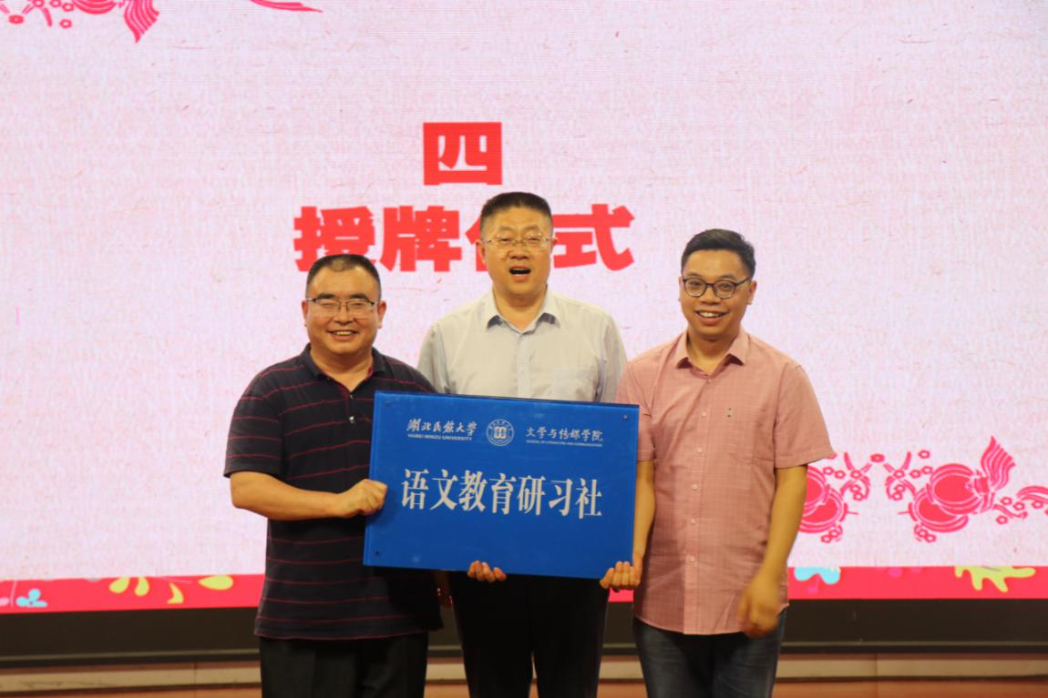 大会举行了隆重的授牌、授旗仪式和颁发聘书仪式。谭世明处长首先为语文教育研习社授牌,中文系主任陈云豪老师和研习社负责人范生彪老师接牌。