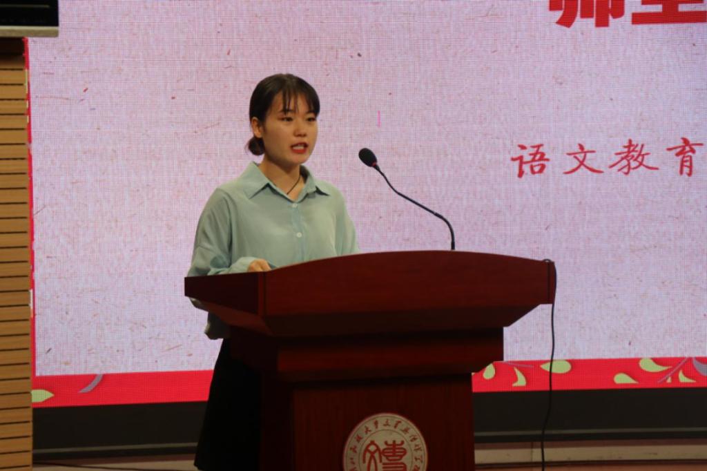 学生代表杨陈媛在发言中,以《让我给你一个加入研习社的理由》为题,结合自己的备赛经历,讲述了在语文教育研习社中,受到老师的悉心指导,不断淬炼绽放的经历,研习社是“海阔凭鱼跃,天高任鸟飞”的专业平台,希望更多同学加入砥砺奋进的光荣团队。