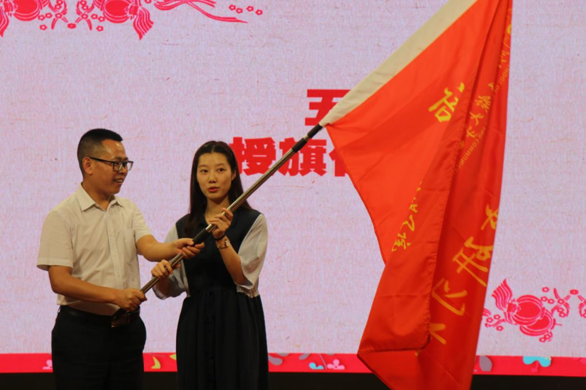 谭华副处长为研习社授旗,社团学生指导组代表刘雪梅同学接旗。