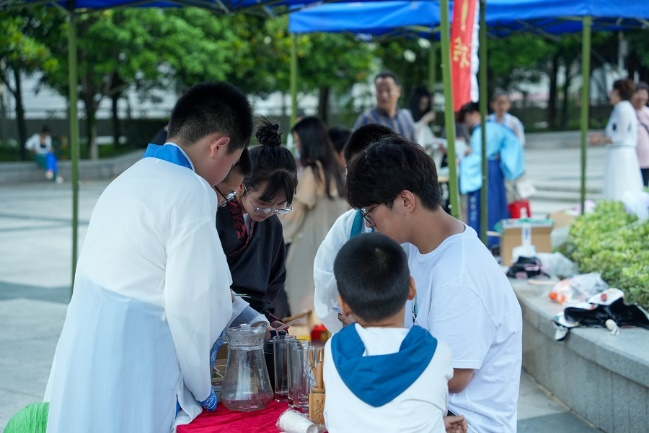 当天下午,茶文化协会与非物质文化遗产研习学社在大学生广场为实验小学学生开展了丰富多彩的户外活动。