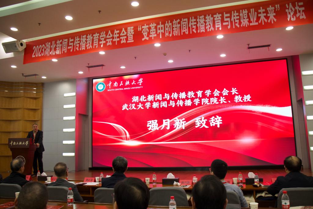 (吴龙胜)10月14日,2023湖北省新闻传播教育学会年会及湖北大学生新闻传播教育创新实践技能竞赛颁奖典礼在中南民族大学举行,来自武汉大学、华中科技大学、中国地质大学等全省各高校百余位专家学者围绕“变革中的新闻传播教育与传媒业未来”进行了深入交流与探讨,中国社会科学院新闻与传播研究所所长胡正荣,暨南大学新闻与传播学院院长、长江学者刘涛分别做了题为“新文科建设与新闻传播人才培养”“新文科背景下的教学创新:主题实践与专创融合”的主题报告,bat365官网文传学院院长张宏树、副院长刘进华,新闻传播系教师吴龙胜参加会议并做主题交流发言。