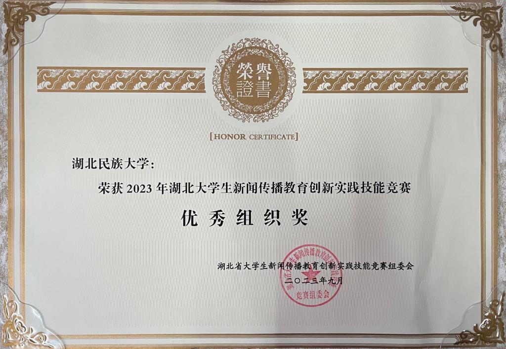 在2023湖北大学生新闻传播教育创新实践技能竞赛颁奖典礼上,文学与传媒学院通过精心组织选送的学生实践作品在赛事中再创佳绩,共获省级一等奖4项、二等奖4项,三等奖3项,位居全省高校前列,省属高校第一,bat365在线中国登录入口荣获2023湖北大学生新闻传播教育创新实践技能竞赛优秀组织奖。
