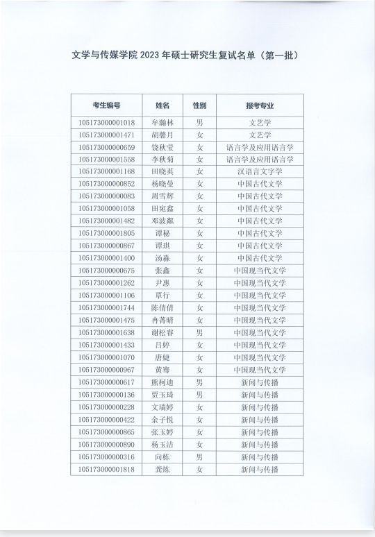 文学与传媒学院2023年硕士研究生复试名单(第一批)