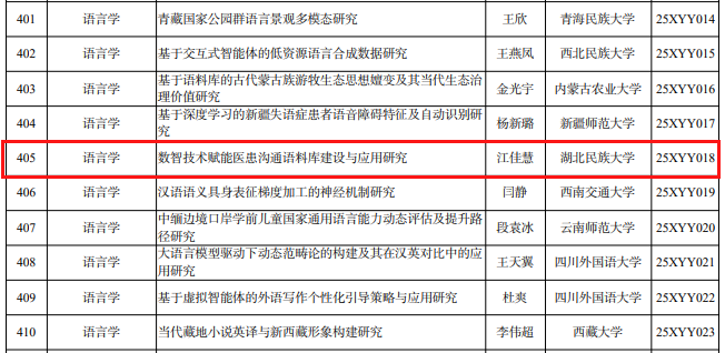 近日,全国哲学社会科学工作办公室公布了2025年度国家社科基金年度项目立项结果,我院江佳慧副教授申报的“数智技术赋能医患沟通语料库建设与应用研究”获西部项目立项。