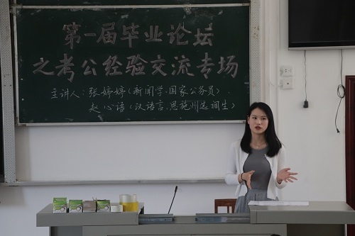 考公专场。2017级优秀毕业生张婷婷考取国家公务员,她从“明确自身需求”“合理制定目标”“掌握学习方法”“把握复习时间”四个方面分享自己的经验。她表示,备考前要结合自身情况正确选择岗位,做好规划,关注人民日报和学习强国等公众号,端正心态,勇敢尝试新鲜事物;2017级毕业生赵心语考上恩施州选调生,她从选调生的含义和条件、集中选调招录对象分享经验。在如何备考这个话题中,她从笔试和面试两个方面来分享自身经验,她提到,笔试要合理规划答题时间,正确选择每一个选项,面试则要把答题思维训练放在首位,跳出模版化答题怪图。