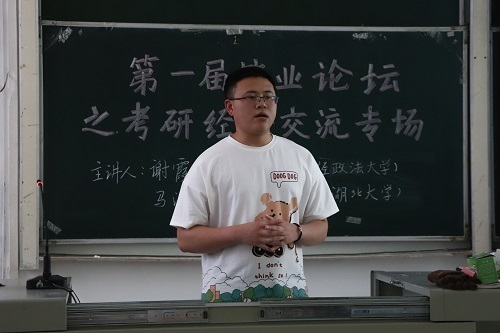 考研专场。2017级新闻学专业毕业生谢霞被中南财经政法大学录取,她就自身的考研经验进行分享。她以“你背不完的书,总有人能背完”为引,回忆自己考研时的心路历程,并结合自身考研经历分享英语、政治及专业课的备考方法。她认为,英语要重视词汇的记忆和积累,可通过“手写翻译”等方式提高英语阅读水平;政治要养成每天背诵和做题的习惯,找准适合自己节奏的老师;专业课要制定阶段性的复习计划,层层深入。同时,她鼓励学生制定目标来达到自我激励的效果,形成自己的学习状态,切忌为迎合他人而迷失自我;2017级汉语言文学专业毕业生马沛考取湖北大学,他围绕“目标院校确定”“考研科目复习”“如何制定学习计划”及“其他好物推荐”四个方面展开经验交流。他表示,要根据发展方向、招生简章及报录比等确定目标院校及专业,并结合亲身经历分享考研英语、政治、专业课的复习方法。此外,他重点强调制定学习计划,建议学生寻找志同道合的研友,营造良好的学习氛围,同时注意劳逸结合。最后,谢霞、马沛与现场学生进行深入交流,结合自身经历为学生答疑解惑,帮助学生找准方向。