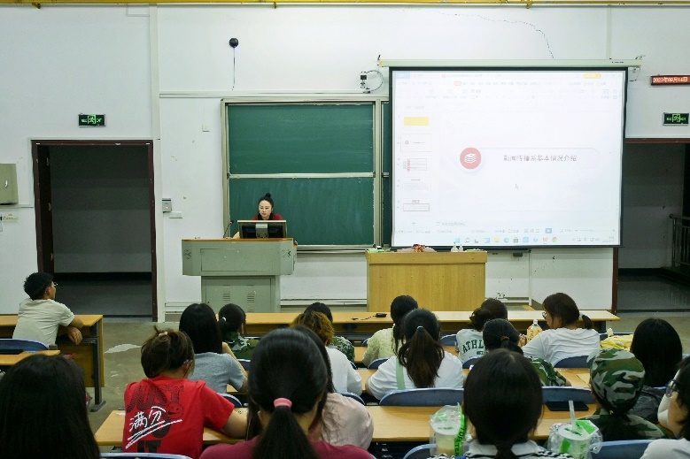 在修远楼5A308教室开展的新闻学、编辑出版学新生专业认知教育中,新闻传播系主任宋艳丽作为主讲人。