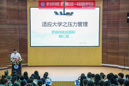 其次,杨仁登对新生进入大学可能存在的心理问题作出深刻剖析。他谈到大学生活与初中、高中生活的差距,从而引申出新生入学可能会面临来自学校、人际、个人发展、就业等各方面的压力,并通过阐述“压力”的定义来强调畸形想法萌生之初正确指引的必要性。