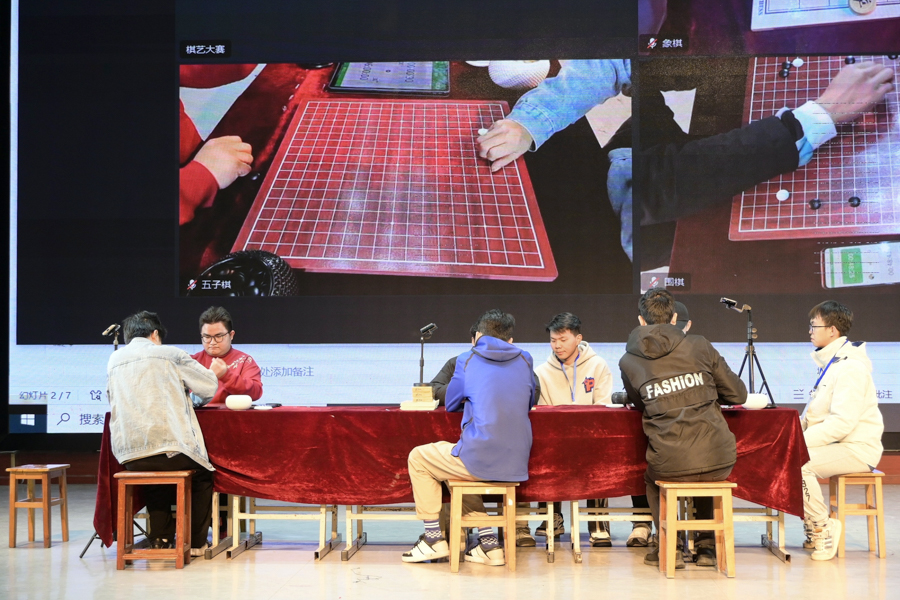 本网讯(记者 汪静柔 徐慧莹/文 通讯员 陆宇 刘光琦 记者 杨清密/图)11月18日,文学与传媒学院、体育学院、外国语学院、马克思主义学院、音乐舞蹈学院、美术与设计学院在音舞演播厅联合举办以“执子在民大,‘弈棋’向未来”为主题的棋艺大赛决赛。