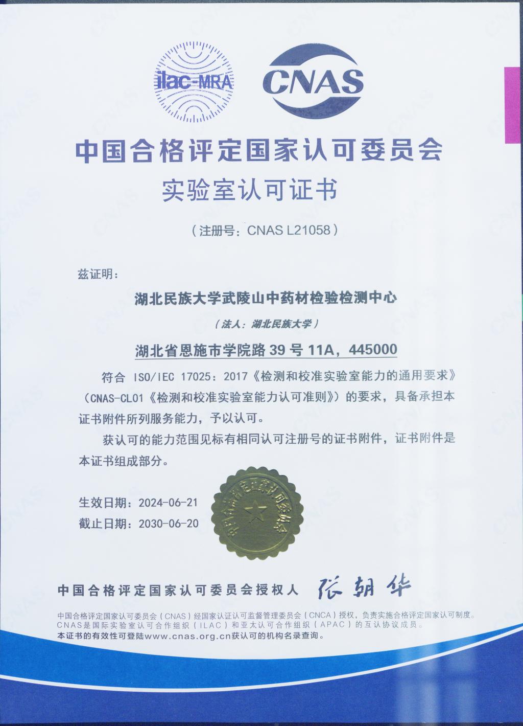 中心位于湖北省恩施市学院路39号(bat365在线中国登录入口校内11号教学楼A区),兼负中药材检验检测和中药材科研两大职能,总建筑面积近8000平方米,其中检验检测场地面积近3000平方米。中心于2021年10月获得检验检测机构资质认定证书(CMA),于2024年6月获得中国合格评定国家认可委员会认可证书(CNAS)。中心作为第三方检验检测机构,内设办公室、质量管理部、质量检测部和技术部,拥有先进仪器设备660余台(套),价值3000余万元,具备2020年版药典一部616种中药材产品、40项参数检测能力。