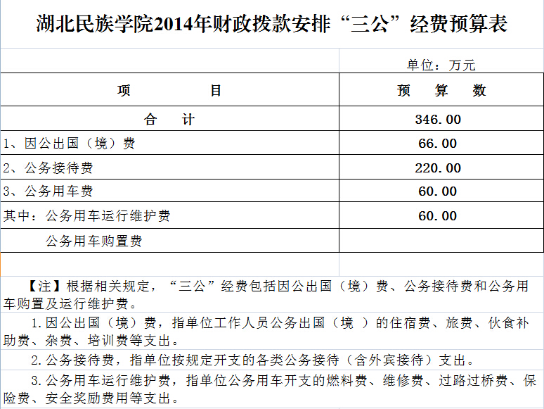 湖北民族学院2014年财政拨款安排“三公”经费预算表