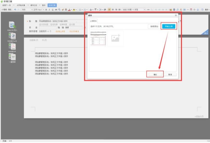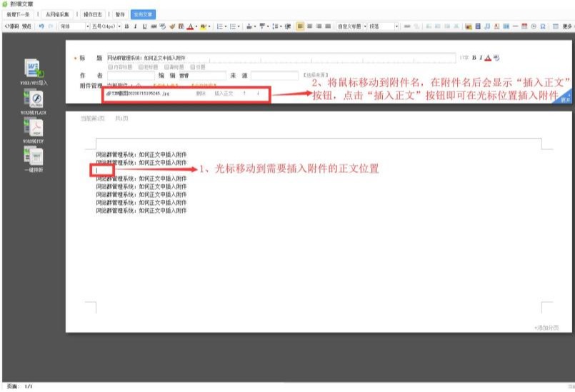 第三步:1、将光标移动到需要插入附件的正文位置;2、将鼠标移动到附件名,在附件名后会显示“插入正文”按钮,点击“插入正文”按钮即可在光标位置插入附件。