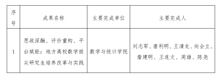 根据《省人力资源和社会保障厅、省教育厅关于开展2025年湖北省教学成果奖评奖工作的通知》(鄂人社奖〔2025〕50号)和《bat365在线中国登录入口教学成果奖评选办法(修订)》(民大校办发〔2025〕5号)文件精神,2025年省级教学成果奖从第二届校级教学成果奖中择优推荐。经学校教学委员会评议,现将拟推荐申报2025年湖北省高等教育(研究生)教学成果奖的成果名单公示如下:
