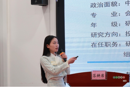 来自经济与管理学院会计专业学位点的候选人沈明月正在进行展示。入学以来,她将学习精力投入到专业技能与素质培养方面,积极参加专业学科竞赛,在第八届全国MPAcc学生案例大赛中取得全校第 2 名,华中赛区第 65 名佳绩,同时,她还主持研究了科研创新项目《公允价值计量关键审计事项披露研究》并取得相应成果。为提升自己的专业技能,她参与到各类专业实践中,积极在会计师事务所和州财政局中承担各类预决算项目的制定和审计工作,通过自身努力在所学专业领域中交了一份完美答卷。