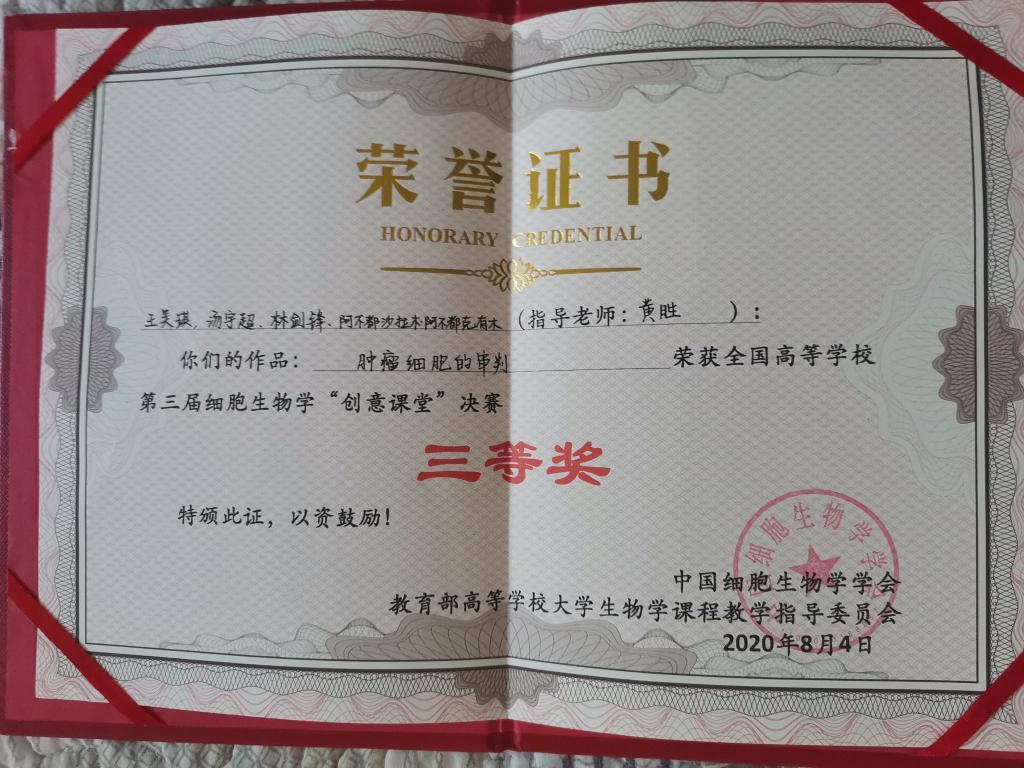 2020年8月4日下午,第三届全国细胞生物学“创意课堂”大赛决赛在苏州成功举办,该项赛事是中国细胞生物学学会举办的重量级活动之一。由医学部基础医学院黄胜博士指导,王美琪、汤宇超、林剑锋、阿不都沙拉木四名同学创作的作品《肿瘤细胞的审判》入围决赛,全国一共仅有10个作品进入决赛,竞争异常激烈,最终该作品荣获细胞生物学创意课堂三等奖。