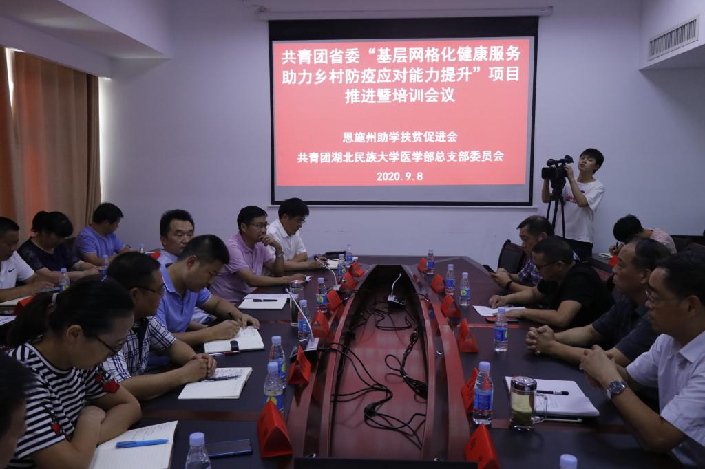 本网讯(通讯员 时若兰 摄影 汪诗名)为助力基层健康扶贫,巩固疫情防控攻坚战成果,强化基层社区健康建设,共青团湖北省委发起实施湖北省社区健康志愿服务项目。9月8日下午三点,由恩施州助学扶贫会和bat365在线中国登录入口医学部团总支共同主办的“共青团省委‘基层网格化健康服务助力乡村防疫应对能力提升’项目推进暨培训会议”在恩施州地税局七楼会议室召开。