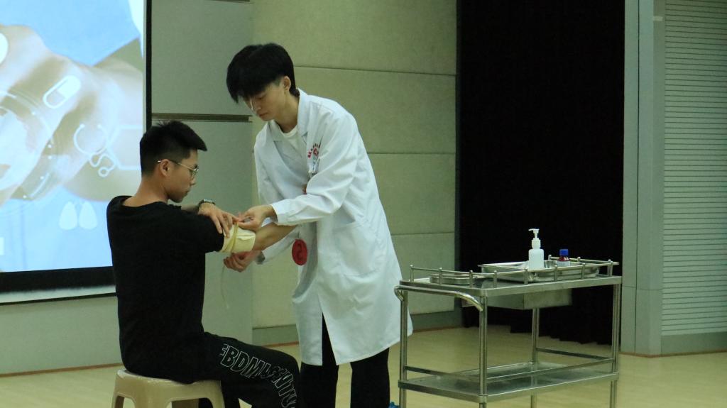 经过前期激烈的角逐,共有十名选手跻身决赛。此次决赛共分心脏复苏术和伤口包扎处理两大环节。在各位参赛选手自我介绍后,比赛正式打响,6号、7号选手给我们带来单人徒手心肺复苏术,其余选手两两组队,展示双人徒手心肺复苏术,他们急速的语气带动全场的紧张氛围,他们熟练的操作赢得观众的热烈掌声。伤口包扎处理环节中,为模拟应急效果,各参赛选手逐一上场选取题号,每个题号对应不同患者的未知伤情,选手结合专业知识,在现场快速分析伤情并选择包扎方法,为现场观众展示他们扎实的急救技能,充分考验选手的临场应变能力。紧接着医学部青年志愿者协会壹家互助社的志愿者为我们带来“救”此刻的急救项目讲解,让同学们更加了解急救知识的重要性。在各位老师评分汇总后,9号选手胡炼炼流利的解说以及专业的操作获得了评委的认可,最终凭借96.5的高分成功夺冠。