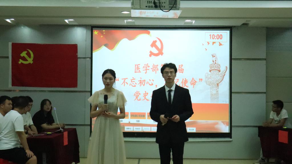 本网讯(记者 许旖蕾/文 曾凡轩/摄)6月20日,由医学部“杏林”青年发展中心举办的第一届“不忘初心,牢记使命”党史知识竞赛于德智楼三楼多功能会议厅举行。医学部党委副书记黄晓波,学生第一党支部书记郑娅,学生第三党支部书记周家頔,学生工作办公室老师袁琳、艾尔肯•吾斯曼应邀参加活动,现场观众200余人。