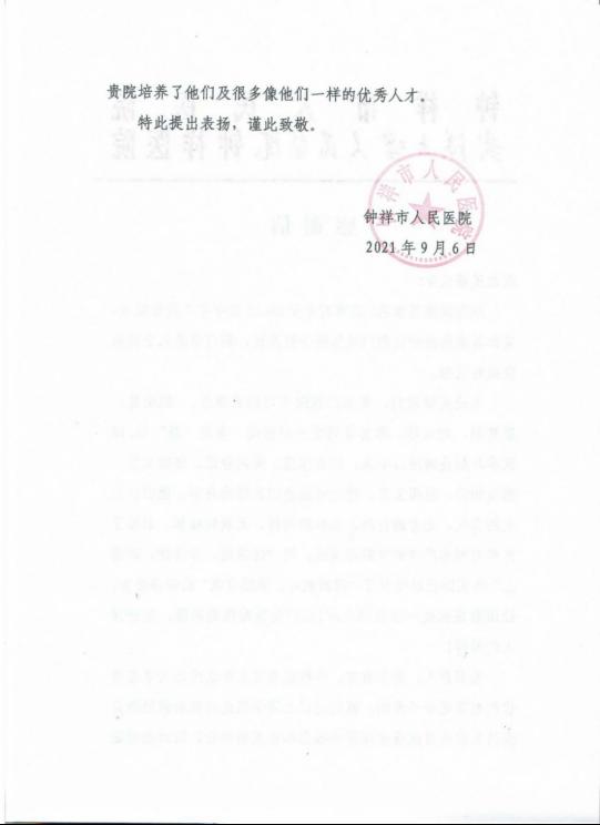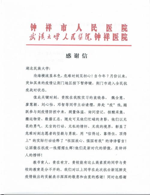 9月6日,实习单位钟祥市第一人民医院就医学部18级医学实习生主动请缨参与防控工作发来感谢信,从用人单位的角度对bat365官网高质量的人才培养表示由衷的感谢。医学部2018级护理学、康复医学专业实习生袁晓春、魏全慧、廖慧颖、刘心怡、邓智在高温下不畏困难坚守岗位,用满腔热忱助力疫情防控工作,践行了bat365官网“博学、博爱、立人、达人”的校训,书写了医者仁心护佑生命的篇章,展现了青年一代的责任与担当。