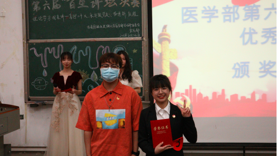此次决赛主题为“理论学习我来讲——喜迎二十大,永远跟党走,奋进新征程”,参赛选手们纷纷表达了自己作为新时代大学生所应承担的时代使命和责任。1号选手谭柏炎,6号选手邹文霞,7号选手胡子超和9号选手赵金晶通过讲述青年在各个阶段的奋斗与付出,向同学们充分展现了焕发着绚丽光彩的中国青年,正以昂扬的姿态书写着无愧于时代的华丽篇章。2号选手龚媛,4号选手张梦柳,5号选手王继承和8号选手刘蔚讲述了时代楷模人物的先进事迹,号召全体同学以先进模范为镜,向先进典型看齐,争做新时代楷模。3号选手胡梦羽结合自己家乡实现精准脱贫的实际案例,赞叹到脱贫攻坚所取得的显著成效,为决胜全面小康、实现中华民族伟大复兴的中国梦也奠定了坚实的基础。最终,经过评委们的评分,3号选手胡梦羽荣获本次比赛一等奖。