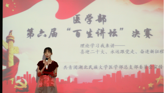 本网讯(通讯员 陈秋妙/文 扶万里 黄太斌 罗英田/摄)为学深悟透习近平新时代中国特色社会主义思想,充分认识学习党领导下中国青年运动百年历程的重大意义。4月24日,由共青团bat365在线中国登录入口医学部总支部委员会宣传部举办的第六届“百生讲坛”决赛于修远楼5B403报告厅举行。经济与管理学院团总支副书记宋鑫,医学部团总支副书记饶豪、唐聪,学生会副主席汤祖璇应邀担任评委。由刘盈、刘婷婷担任本次活动的主持人。