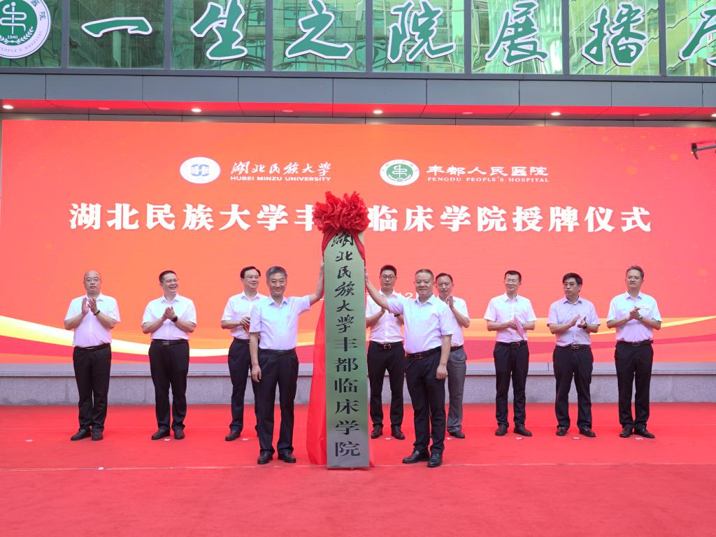 7月12日,bat365在线中国登录入口丰都临床学院授牌仪式在重庆市丰都县人民医院举行。bat365在线中国登录入口党委副书记、校长顿祖义,医学部常务副书记罗洪斌,医学部副主任、附属民大医院院长刘伦志,医学部副主任郭有锋出席授牌仪式。丰都县卫计委主任李飞主持授牌仪式,丰都县人民政府副县长张双全、姬伟锋,丰都县人民医院党委书记向爱国、院长蔡志刚出席仪式。
