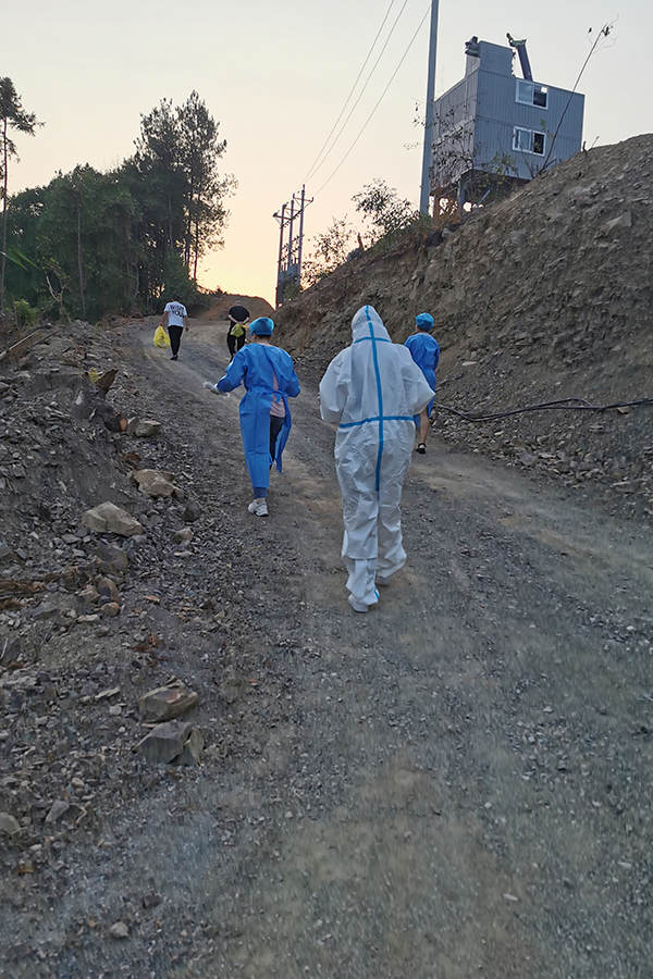 这支队伍负责的区域是市政府大院,这里是老旧小区,共有20栋步梯房,志愿者们冒着高温,穿着防护服,每一栋都要从1楼爬到7楼,来回往返。三人组里有位女生是第一次参与入户核酸采样,由于防护服穿着全封闭,她大量出汗,因进水不便差点脱水。途中社区网格员一直加油打气,建议若她坚持不住的话就可以休息一下。但她坚定地回答:“我一定会完成任务,与同伴一起完成采样任务,与同伴共奋进。”回到休息区脱下防护服的那一刻,志愿者们鞋子、手套、口罩里全是汗水,下沉的党员干部以及工作人员看到此状连忙去到居民家中冲来白糖水为志愿者们补充能量。