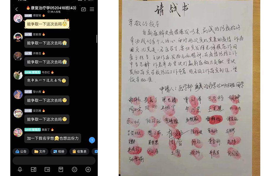 0520418班班长谢梓言告诉记者,其实在医学部发布征集第四批战疫志愿者的通知后,班级的QQ群里迅速被一条条请战申请刷屏,37位同学在班级群里接力请战。