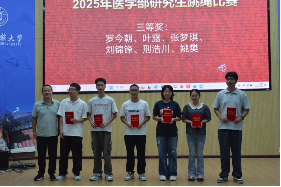 迎新文艺晚会开始前,首先进行了“绳”采飞扬,活力研途—2025年医学部研究生跳绳比赛”的颁奖仪式,陈思颖,王东旭等12名同学分获一二三等奖。