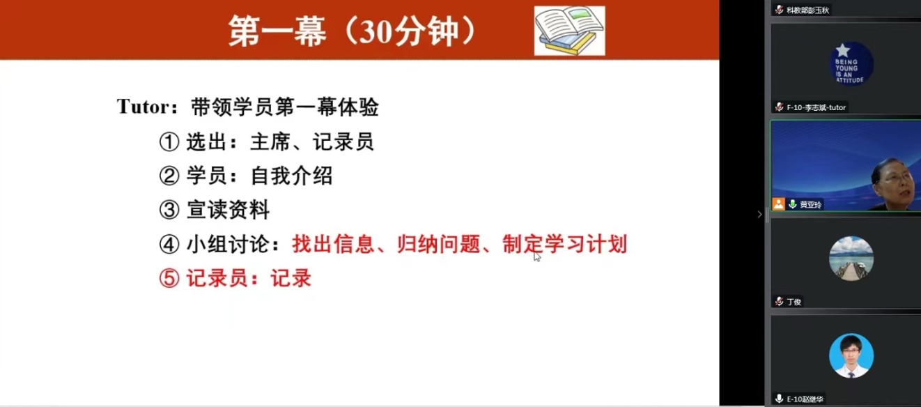 在本时间段黄亚玲教授首先带领参加培训的老师进行了一次线上教学基本测试,为老师们高质量的完成本次培训打下了坚实的基础。然后带领所有学员以学生的身份,对一个PBL教学案例亲自体验了一堂PBL课程教学。学员们对于PBL课程的授课方式有了非常直观和形象的认识,也为更好理解后续的理论课程打下了坚实基础。
