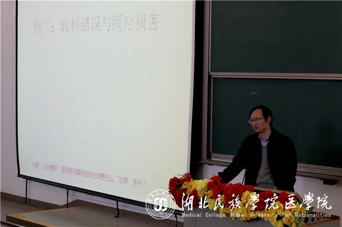 携智者同行,与高人为伍!为使医学生近距离感受名家医师的专业素养和学者风范,丰富医学生文化生活、提升医学生人文素养;同时围绕医学生德育教育,弘扬“两高”精神,追求“ 德为先、魂为镜”的医者之魂,医学院拟将4月份定为医学生专业思想教育月,特举办“名医名师大讲坛”专题教育活动。“专题一:医疗纠纷处理——医疗损害赔偿”于3月31日在修远楼5B404教室激情开讲,上海市海上律师事务所的刘晔律师担任主讲嘉宾,我院老师熊茂来、董兴高、杨宁等出席报告会,现场观众近250人。