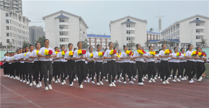 伴随着昂扬的运动会进行曲,各代表队踏着朝阳依次入场,国旗护卫队迈着整齐的步伐,昂首挺胸地走向主席台,医学院展板、彩旗、鲜花方阵及各二级学院方阵队一一入场。