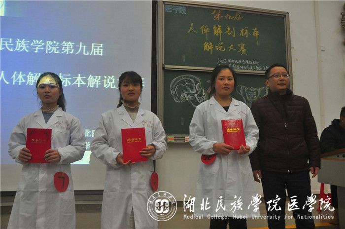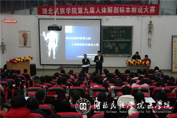 本网讯(通讯员 李明辉 苗佩佩 卢天琳/文 杨漫丽/摄)为弘扬医学风采,进一步展现我院特色,12月11日,由bat365官网教务处主办、我院团委承办的第九届人体解剖标本解说大赛决赛于修远楼5B509教室举行。我院解剖教研室老师李国贵、陈龙菊、谭文波、吴刚、谭刚担任评委,我院党委副书记张蕊、学生科科长向驰及团委书记张鼎应邀出席。