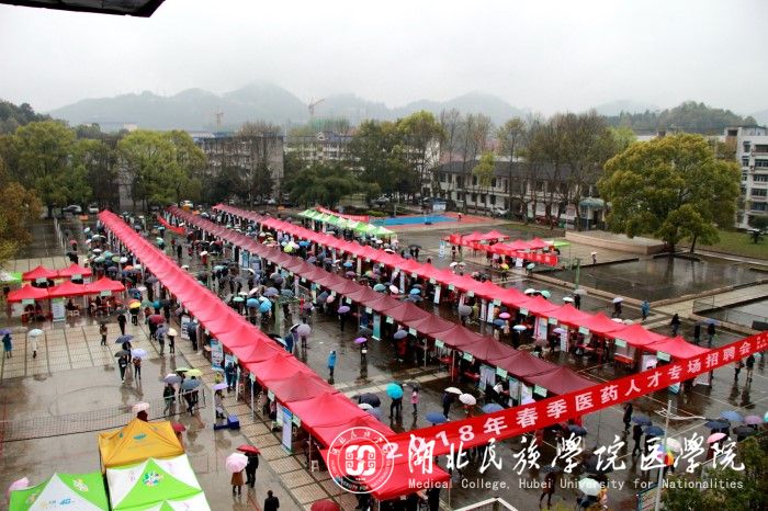 本网讯(记者 冷红豆 郭曼 通讯员 黎晓容 卢天琳 摄影 熊慧雯 肖智仁 杨漫丽 富珂 )3月24日,2018年春季医药人才招聘会在湖北民族学院团结广场成功举行。本次招聘会由湖北民族学院、湖北民族学院科技学院、恩施州公共就业与人才服务局、恩施市公共就业和人才服务局联合主办,湖北民族学院医学院承办。湖北民族学院科技学院校长池永文、党委书记廖云、湖北民族学院招生就业处处长周腾蛟,医学院党委书记刘红等领导亲临现场,并与招聘单位负责人以及应聘学生进行现场交流。