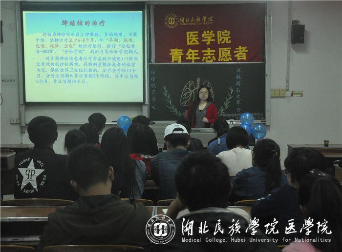 本网讯(通讯员 刘峻银/文 吕丰旭/摄)为向在校学生普及结核病防治知识,进一步做好防治措施,3月30日晚,我院于8302教室成功举办以“开展终结结核行动,共建共享健康中国”为主题的防治肺结核培训会,我院总支部委员会特邀恩施州疾病预防控制中心别玉萍老师担任培训会主讲人,我院青年志愿者协会成员与会。