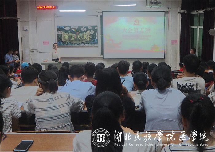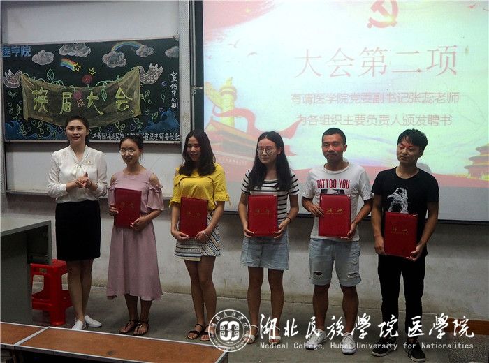 本网讯(通讯员 卢天琳/文 吕丰旭/摄)7月2日晚8点,由共青团湖北民族学院医学院总支部委员会主办的2017-2018学年度学生干部换届大会于医学院8103教室顺利举行。我院党委副书记张蕊,学生科副科长周家頔,学生科老师郑娅、梁丹玉、向涵、冷红豆应邀出席并担任嘉宾。我院团委书记张鼎担任主持人。