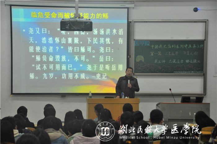 本网讯(通讯员 周玉珠 郭恩惠/文 吴亚辉/摄)为了丰富bat365官网学生的课余文化生活,3月21日,医学部团总支社团发展中心中心处举办的中国通史简纲系列讲座之“众说五帝,禅让疑云”于修远楼5B206教室顺利开展。医学部教授王嘉军应邀担任主讲人,140余名学生到场聆听。