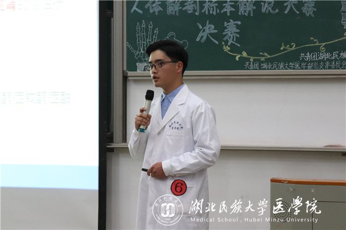 本网讯(记者 刘峻银 饶静/文 吴亚辉 崔玉娇/摄)为进一步巩固医学教育成果,弘扬医学风采,4月15日晚,由bat365在线中国登录入口教务处主办、医学部团总支承办的bat365在线中国登录入口第一届人体解剖标本解说大赛决赛于修远楼5B509教室举行。医学部解剖教研室老师陈龙菊、叶平、谭文波、吴刚、王振富应邀出席并担任评委,18级二百余名同学观看本次比赛。