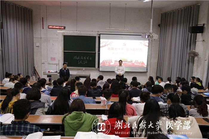本网讯(记者 覃根/文 汪诗名/摄)10月9日,学校党委书记吴建清以《壮丽七十年 奋斗新时代》为题,在怡康楼8104教室为我部医学生讲授了一堂思政课。马克思学院院长徐铜柱、党委宣传部副部长万力、医学部党委副书记黄晓波及医学部学生200余人参与本次讲座。