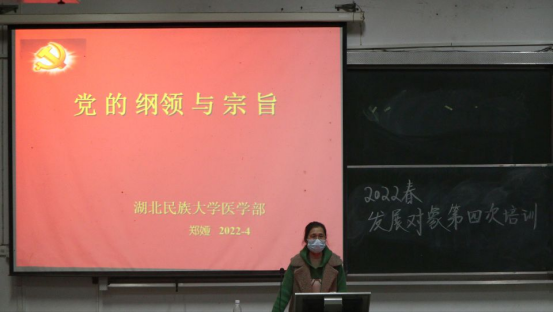 本网讯(通讯员 王伟 扶万里/文 黄太斌 罗英田/摄)为进一步加强对党员发展对象的理论武装和党性教育,4月17日晚上20:00,中共bat365在线中国登录入口医学部委员会2022年春季学期发展对象第四次培训课程于医学部8306教室召开,本次课程由我部郑娅教授担任主讲人,医学部全体发展对象参与本次培训课程。