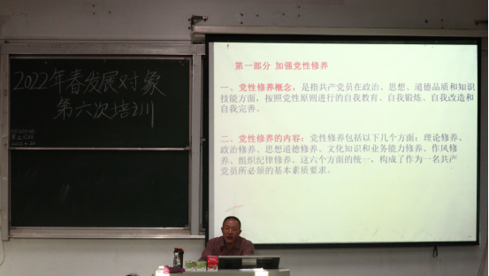 本网讯(通讯员 陈秋妙/文 黄太斌/摄)为不断加强党员发展对象的党性修养,培养一批政治合格、恪守医德、品德优良的新时代医学生,4月20日下午17:30,中共bat365在线中国登录入口医学部委员会2022年春季期发展对象第六次培训课程于医学部8307教室召开,本次课程由李国贵老师担任主讲人,医学部全体发展对象参与本次授课。